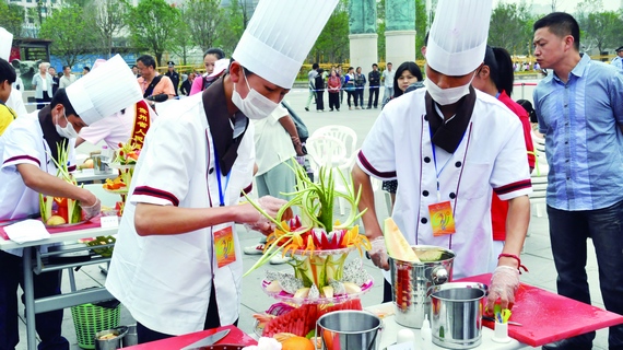 • 貴州省旅游學校學生在技能大賽上展示果盤雕刻技藝