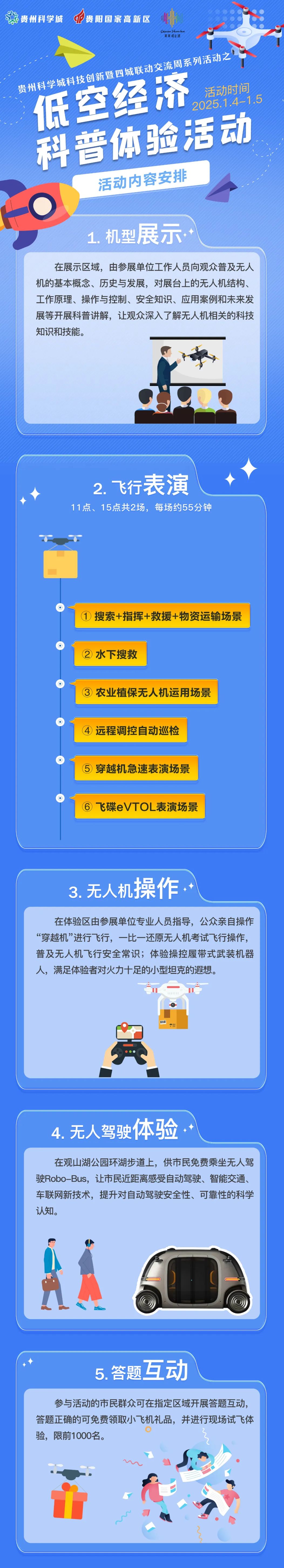 1月4日至5日,貴州科學城科技創新暨四城聯動交流周系列活動之低空經濟科普體驗活動將在觀山湖公園民族大聯歡廣場舉辦。 此次活動為期兩天,活動期間,來自貴陽高新區、觀山湖區、雙龍經開區以及成都高新區的10余家低空經濟企業,將為廣大市民群眾展現各自的“看家本領”,與全民共赴一場低空經濟的科普之旅。 據了解…[詳細]
