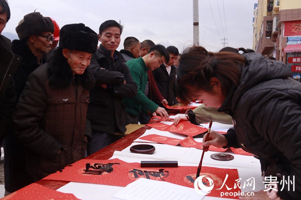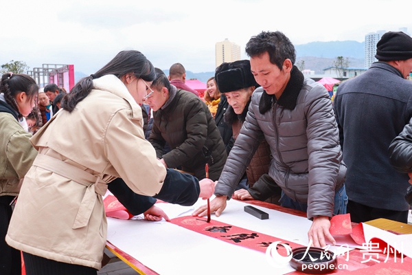 美術學院為當地群眾書寫“迎春接福寫春聯 揮毫潑墨賀新年”主題活動。 貴州師范大學黨委宣傳部供圖