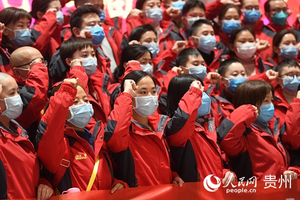 貴州省第七批援鄂醫療隊出征現場,全體隊員莊嚴宣誓。武敏 攝