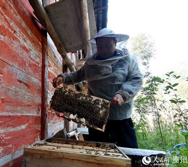 向國富正在查看蜂蜜釀制情況。施平 攝