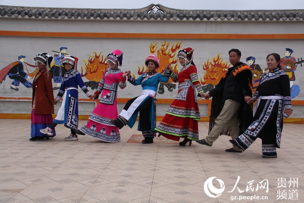 建行貴州省分行向威寧縣板底鄉(xiāng)新華村捐贈修建文化廣場,圖為彝族村民在文化廣場上載歌載舞。建行貴州省分行供圖