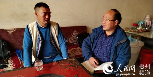 建行派駐威寧縣新華村駐村干部何登亮(右)了解村民生產生活情況。建行貴州省分行供圖