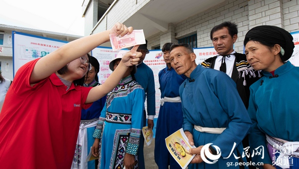 建行志愿者為畢節(jié)市威寧縣新華村村民講解識別人民幣等金融知識。建行貴州省分行供圖