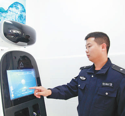 織金縣珠藏鎮(zhèn)警務(wù)助理肖發(fā)陽(yáng)在展示智能機(jī)器人如何使用。本報(bào)記者 黃 嫻攝