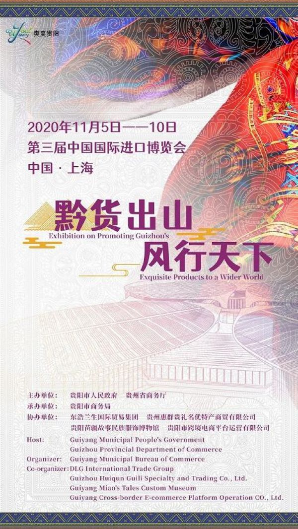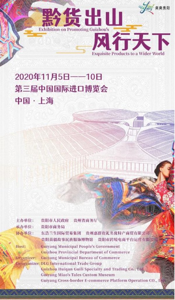 主題海報采用了,貴州苗族的代表圖騰“蝴蝶媽媽”紋樣、爽爽貴陽、logo、2020進博會場館剪影精心組合而成