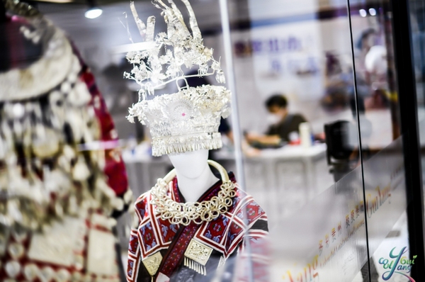 除了古老的苗繡,在“多彩貴州 爽爽貴陽”館里還展出了貴銀產品,貴州有著千百年的制銀歷史,豐富的的民族銀飾文化,成熟的傳統制銀手工藝是“貴銀”品牌建立的根基,而古老民族神話中所體現的愛與生命,也賦予“貴銀”產品靈魂。苗繡與銀飾的結合,無疑中多了一份別致的美。