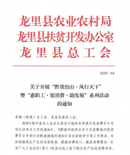 為助力消費扶貧工作取得可觀成效,此次活動得到了龍里縣的大力支持,縣農業農村局、縣扶貧開發辦公室、縣總工會聯合下發《關于開展“黔貨出山·風行天下”暨“惠職工·促消費·助發展”系列活動的通知》,在全縣范圍開展系列活動。在11月21日的展銷會活動啟動儀式現場,龍里縣政府領導班子、相關部門負責人將帶頭通過“一碼貴州龍里團購”自主選擇購買農特產品,并動員全縣工會會員(職工)進行線上購買。參與活動的工會會員11月18日18點就可進入“一碼貴州”平臺進行線上自主采購。