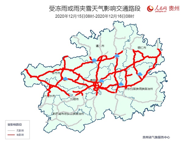 未來24小時受凍雨或雨夾雪天氣影響交通路段。貴州省氣象服務中心提供