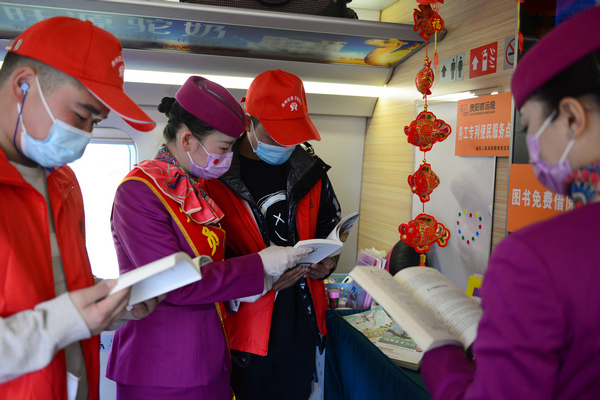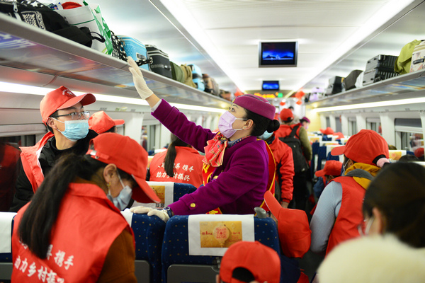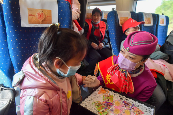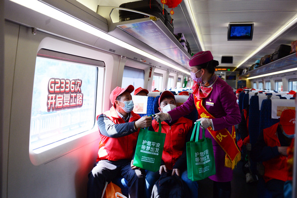 G2336次務工專列上乘務員為旅客發放防疫愛心包。