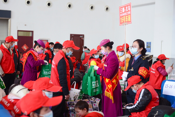 據悉,當天由貴陽北開往寧海的G2334次列車上,170名貴州籍務工人員前往紹興。至24日,成都局集團公司還將配合組織10余個批次共計3000余名貴州籍務工人員從貴州貴陽、畢節、六盤水等多地出發,前往寧海、紹興、金華、義烏、廣州方向復工。貴陽客運段會持續做好疫情防控,后續將有5000份“愛心包”發放給貴州籍務工人員,為復工旅客出行保駕護航。