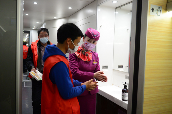 值乘G2336次務工專列的貴陽客運段動車二隊,當天抽調業務素質過硬的黨團員擔當乘務工作。列車上嚴格落實疫情防控要求,對廁所、洗臉間、扶手、通過門開關等列車公共區域重點部位每4小時不少于一次預防性消毒,加大衛生清潔頻次的同時,每節車廂增配有免洗手消毒液。