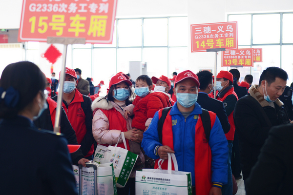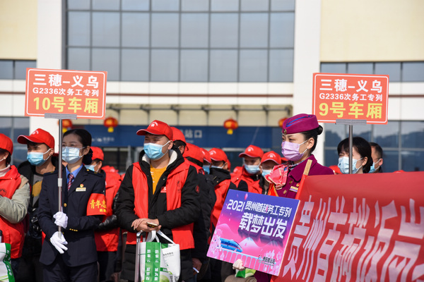 2月20日11時49分,由貴陽北開往南京南站的貴州首趟務工專列G2336次從三穗站駛出,來自貴州省黔東南州錦屏縣的550余名外出務工人員從該站搭乘專列前往浙江義烏返崗復工。該趟列車當天重聯運行,其中9號至16號車廂專門提供給錦屏縣務工人員使用,途中沿途各站不辦理客運業務,最大程度減少務工人員與其他旅客接觸。