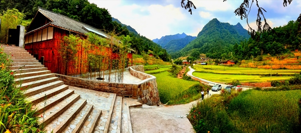 在習(xí)水縣大坡鎮(zhèn)田壩村,古色質(zhì)樸的特色民宿佇立在金黃的稻麥間,喜迎游客前來。周東亞 攝