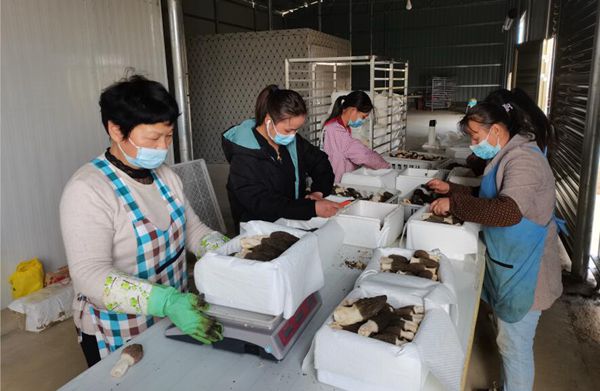 基地大棚里,成片的羊肚菌破土而出,生機盎然。村民們正忙著采摘、裝運、分撿、打包,臉上洋溢著豐收的喜悅。村民姚洪芬自從基地建立以來就一直在基地里務工,“家門口”產業讓她賺錢顧家兩不誤。