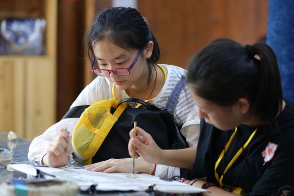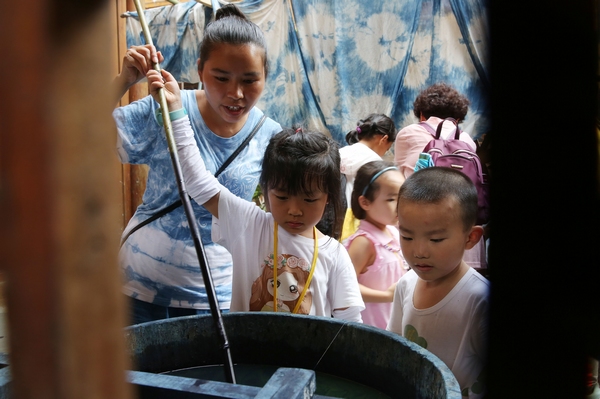 侗族婦女在指導小學生體驗藍靛水染的蠟畫作品。中共黎平縣委宣傳部提供