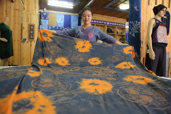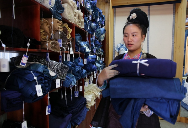 陸勇妹在整理顧客購買的靛染土布產品。中共黎平縣委宣傳部提供