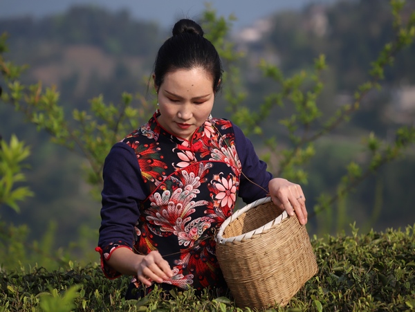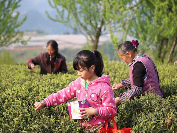 桐梓游客體驗采摘仙人山茶葉。張維攝