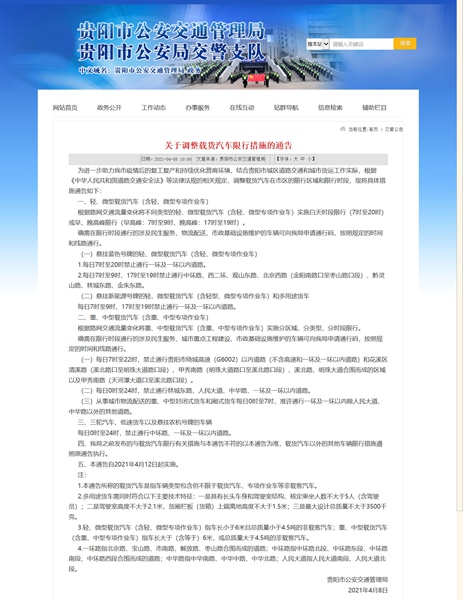 對此,為進一步助力復工復產和持續優化營商環境,貴陽市公安交通管理局按照“放寬限行區域、縮短限行時段、實施差異化管理、為城市物流配送車輛提供更多通行便利”的原則,對市區貨車限行措施進行進一步調整。
