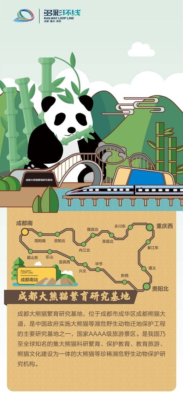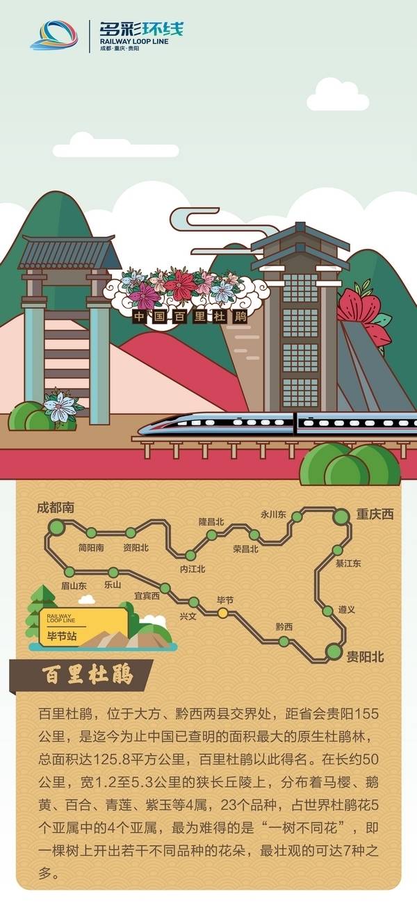 “多彩環線”是連接“川渝黔”三地的國內首條跨省高鐵環線,由成渝高鐵、成貴高鐵、渝貴高鐵3條線路組成,在四川、重慶、貴州三個省級行政區之間跨省成環。全線運營總長超過1290公里,全程運行時間約8小時,于2020年4月開行,2021年初更換為復興號300AF動車組擔當。