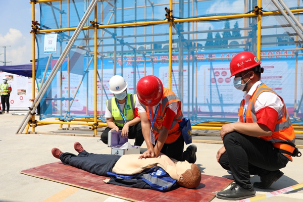 活動傳達了《觀山湖區建筑施工2021 年“安全生產月”和“安全生產基層行”活動方案》等。活動現場,參加人員一同觀看了安全微電影《平安是福》,并進行了高空作業應急救援演練,模擬施工現場一名工人從高處墜落,現場人員立即組織醫療救護、現場搶險、警戒疏散、后勤保障等救援力量開展緊急救援,現場檢驗項目施工現場高處墜落應急救援預案的可操作性和有效性,進一步增強該行業從業人員的安全意識和應急救援能力。