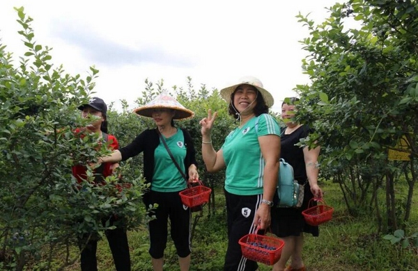 游客在甲良藍(lán)莓基地采摘藍(lán)莓。