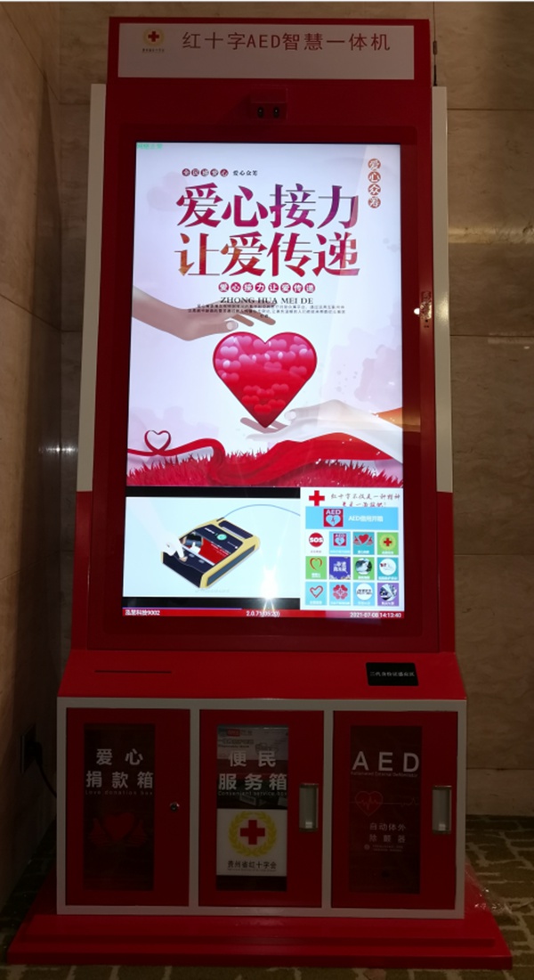 據了解,“紅十字AED智慧一體機”由貴州省紅十字會聯合愛心企業貴州泓慧科技有限公司自主研發,集合AED應急救護、人臉識別、體溫檢測、志愿者參與、愛心慈善、智慧平臺管理應用等系統平臺,通過環境營造、物聯技術應用為公眾提供便捷的應急救護設備查找、應用和急救知識學習等服務。