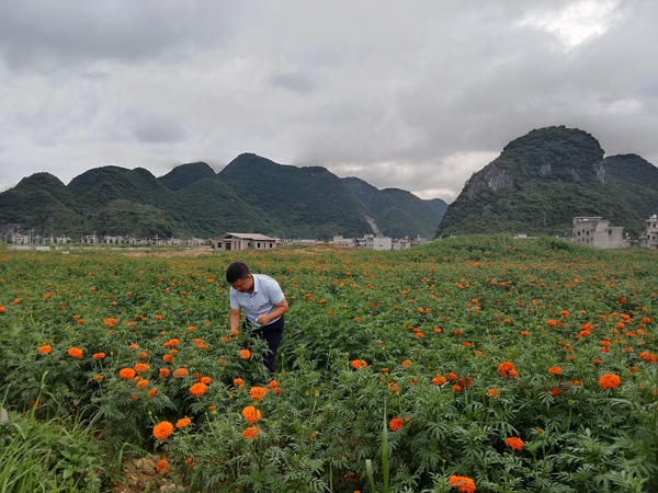 黃恒禮察看萬壽菊生長情況。嚴興友攝