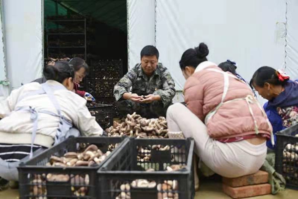黃恒禮支書(中)與村民一起分裝食用菌。楊杰攝