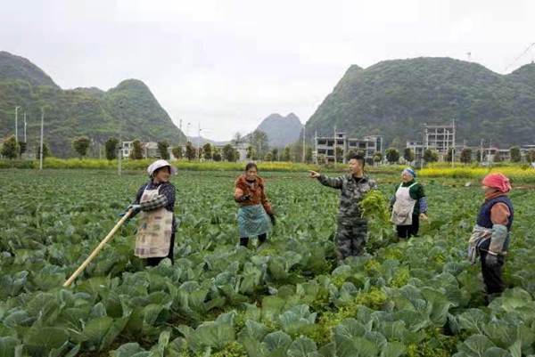 黃恒禮支書(中)與村民一起管護甘藍。楊杰攝