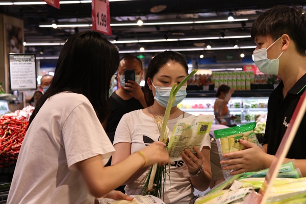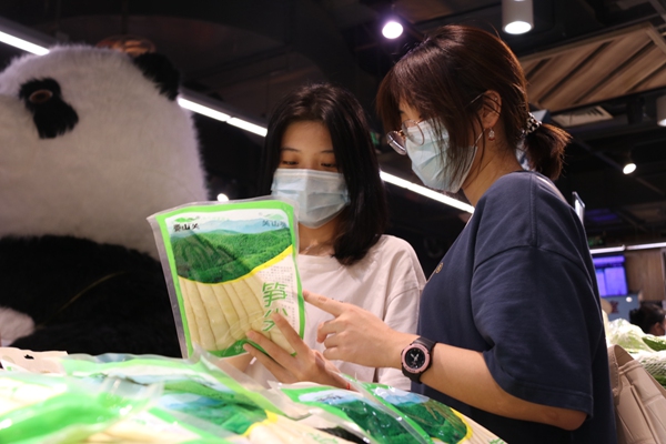 在重慶市沙坪壩區永輝超市嘉茂店的生鮮區,銷售人員正在熱情地向顧客推銷“婁山關”牌方竹筍,顧客們提著籃子、推著購物車,在攤位上駐足停留,了解、選購。