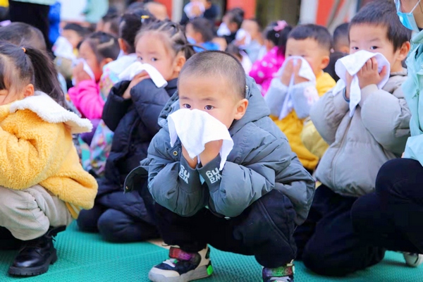 11月8日下午3點整,消防演練正式開始。隨著警報聲響起,在各班教師帶領下,孩子們快速用打濕的毛巾捂住口鼻,彎著腰小步快走,沿著預定的疏散路線,有序地撤離至戶外安全地帶。