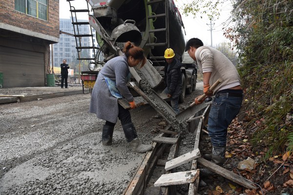 日前,在畢節市納雍縣利園街道青云大道通往和瑞社區場口組的通組路施工現場,3輛混凝土攪拌車來回穿梭,10余名施工人員忙著支模板、鏟砂漿、鋪路面。已經凝固的通組路,寬闊平整。