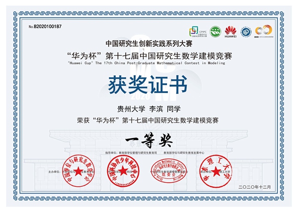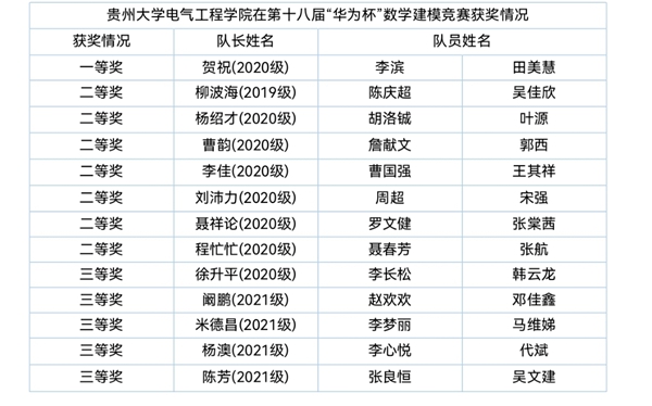 人民網貴陽12月24日電 近日,“華為杯”第十八屆中國研究生數學建模競賽成績揭曉。貴州大學電氣工程學院斬獲佳績,獲得全國一等獎1項,二等獎7項,三等獎5項。這也是學院連續三年喜獲該項賽事全國一等獎。