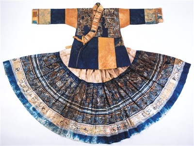 宋代鷺鳥紋彩色蠟染女套裝是展廳里唯一一套考古出土的服裝,1987年出土于貴州省平壩縣桃花村。該套裝上身為齊腰上衣,前襟和后背為整幅彩色蠟染片,袖口用絲線貼繡鎖邊。下身為百褶裙,采用蠟染間填色工藝繪鷺鳥紋兩周。這套服裝蠟染線條流暢纖細,技藝爐火純青,為研究古代蠟染提供了珍貴實物資料。