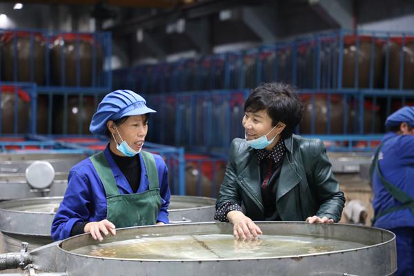 余留芬委員與酒廠車間員工交流。圖片由受訪者提供