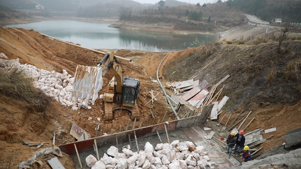 工人們正在進行水庫壩坡預制塊拆除。