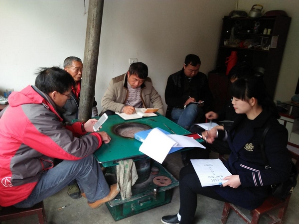 落掌村支書鄧佩建(右三)召開晨會,安排部署合醫征繳工作。