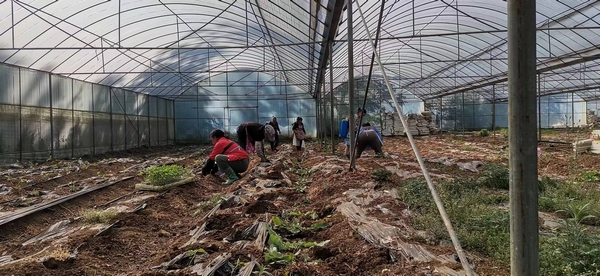 村民正在辣椒大棚里勞作。