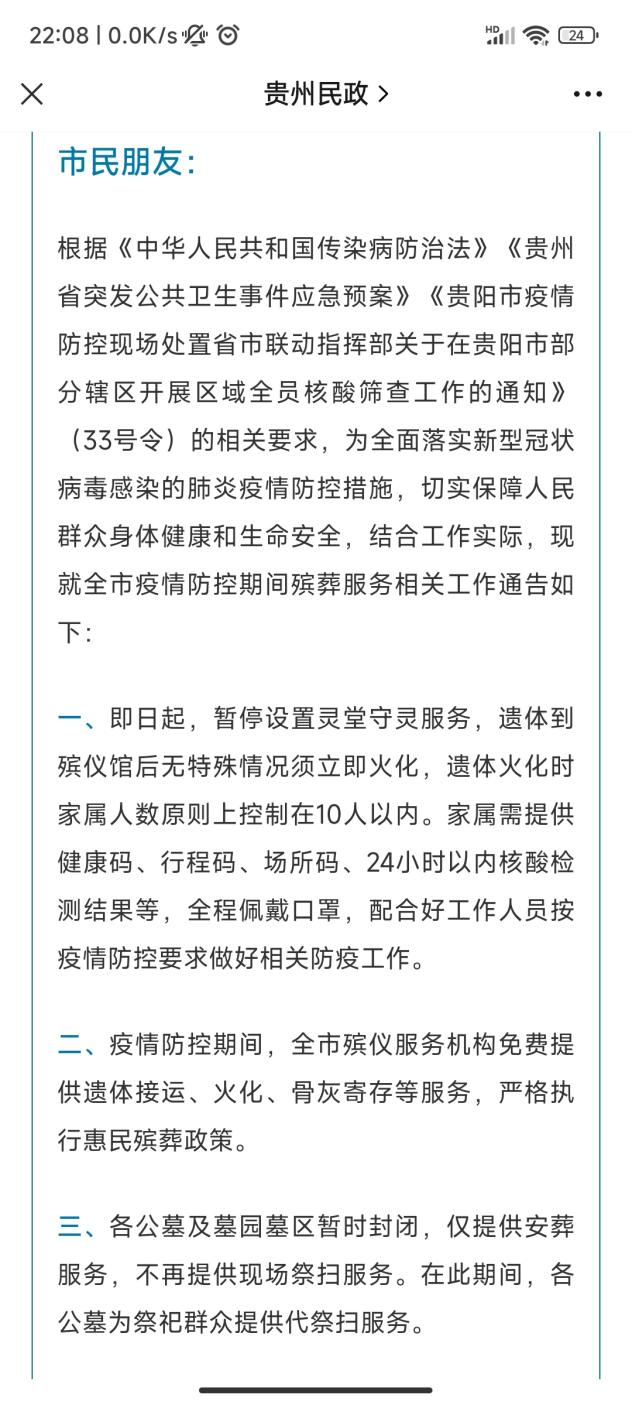 記者還發(fā)現(xiàn),早在9月3日,貴陽市殯葬管理所就發(fā)布通告:疫情防控期間,全市殯儀服務(wù)機構(gòu)免費提供遺體接運、火化、骨灰寄存等服務(wù),嚴格執(zhí)行惠民殯葬政策。