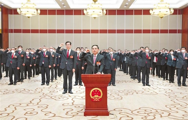 選舉結束后,省十四屆人大一次會議新當選人員舉行了憲法宣誓儀式。在新當選的省十四屆人大常委會主任徐麟領誓下,新當選的省十四屆人大常委會副主任、秘書長,省人民政府省長、副省長、省監察委員會主任,省高級人民法院院長,省十四屆人大常委會委員、省十四屆人大專門委員會組成人員向憲法宣誓。