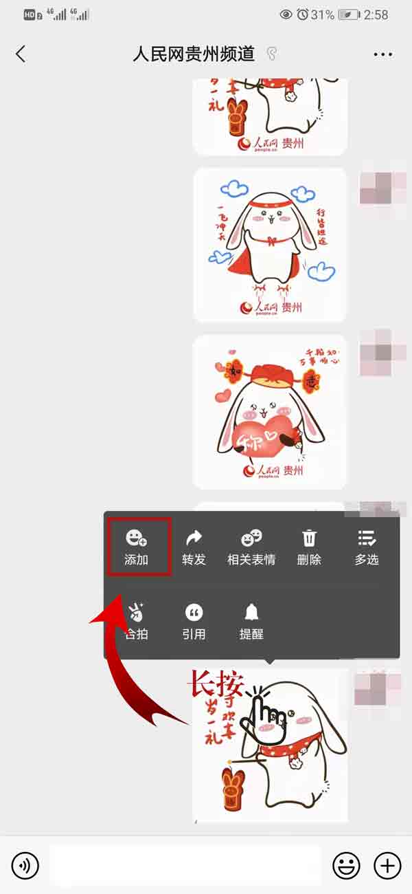 2、手機(jī)端:第一次使用時(shí),微信打開本文,在文中長按表情即可“轉(zhuǎn)發(fā)給朋友”;隨后在聊天對話框長按表情“添加”即可保存長期使用。