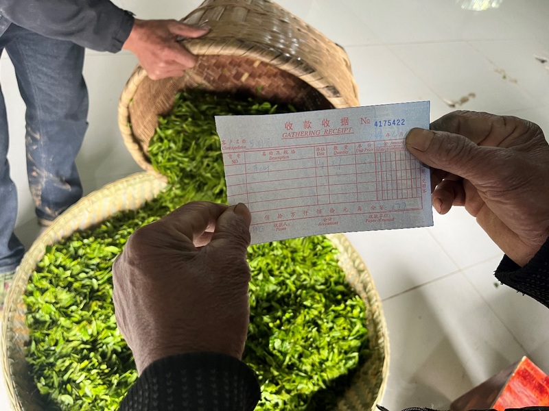 在貴州省銅仁市石阡縣的國家現代農業產業園里,茶農們三五成群,背著茶簍,雙手翻飛,搶摘今年的“雨前茶”。經過一上午的辛勤勞作,70歲的吳明富和妹妹一起采了5.9公斤茶青。在茶山下石阡縣苔茶集團設立的茶青集中收購點,工作人員評定吳明富采摘的茶青都是“一芽二葉”,品質不錯,便按15元一斤的價格收購,現場支付了吳明富177元的采茶費。