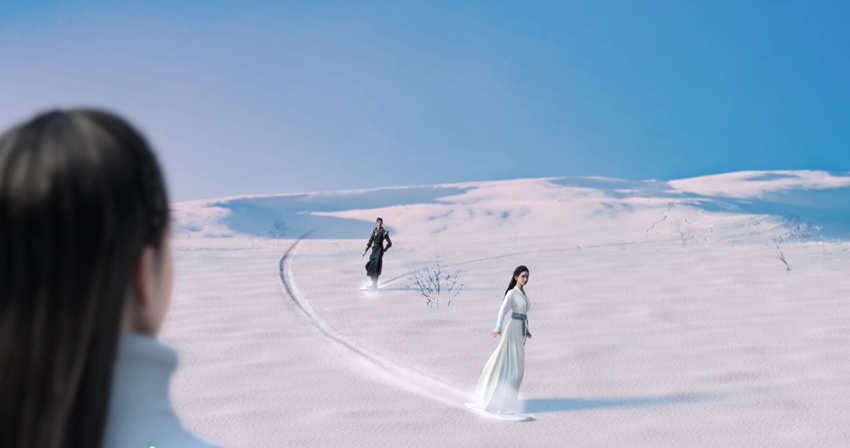 宣傳片開篇,穿過云霧,長白山呈現在大家面前,故事從這里開始,主角“初一”“玄龍”登場。作為冰雪愛好者的“初一”“玄龍”分別來到長白山,各自在冰雪場景以及雪花的觸發下,他們同時感應到了前世碎片的記憶。雪花是記憶的載體,當“初一”眉間的雪花印記點亮時,便開啟了他們跨越千年的冰雪之約。