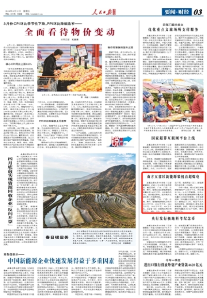 今年一季度,南方五省區新能源新增投產1254萬千瓦,同比增長72%。從出力貢獻看,今年以來,南方五省區新能源單日最大發電量已6次創歷史新高,日發電滲透率(發電量占總裝機出力的占比)最高達31.12%,相當于當天每用4度電、就有超過1度電來自新能源。目前,南方五省區新能源發電量達653億千瓦時,同比增長67%。