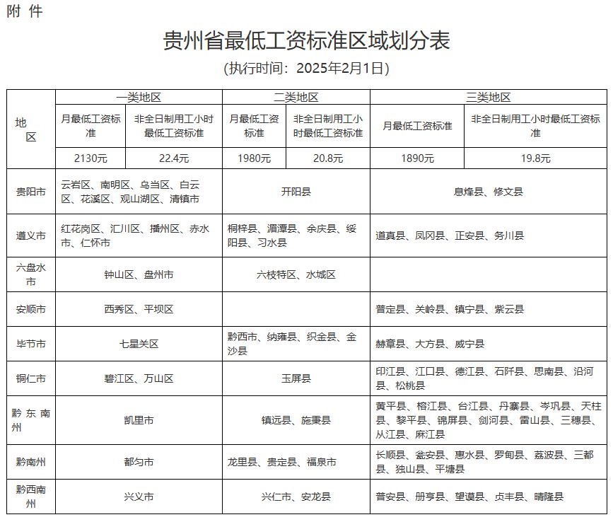 本次調整的最低工資標準從2025年2月1日起執(zhí)行。2022年印發(fā)的《貴州省人力資源和社會保障廳關于調整貴州省最低工資標準的通知》(黔人社發(fā)〔2022〕31號)同時廢止。