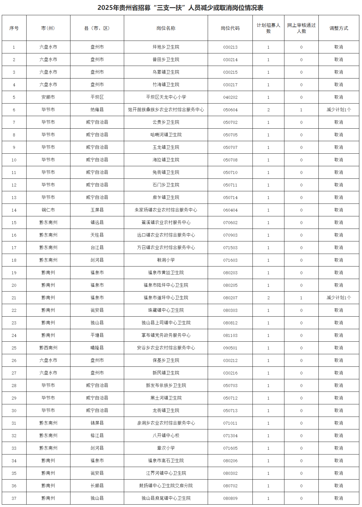 2025年貴州省招募“三支一扶”人員網上審核工作已結束,部分崗位通過網上審核人數與計劃招募數不達規定比例,根據《2025年貴州省高校畢業生“三支一扶”計劃招募公告》安排,現將減少或取消崗位情況公告如下: