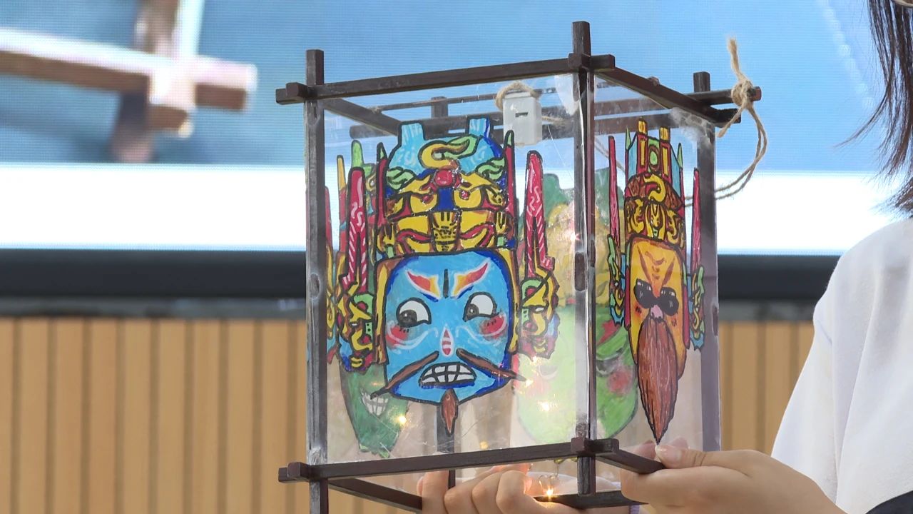 學(xué)生們的創(chuàng)新作品亮點(diǎn)紛呈。他們將地戲臉譜畫(huà)在花燈燈具上,巧妙地將花燈和地戲融合在一起。