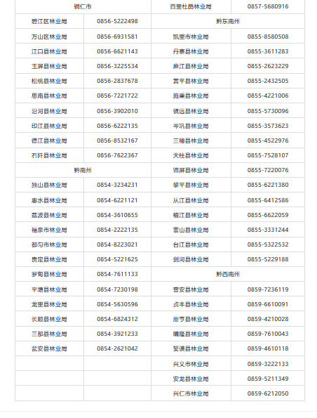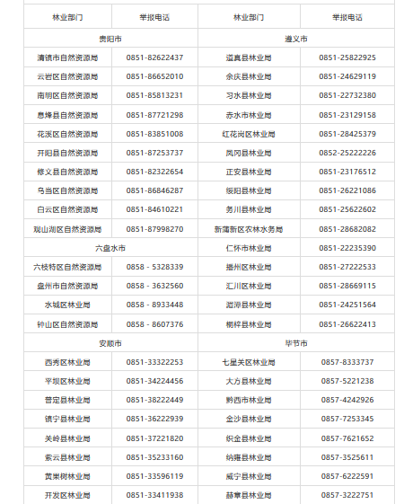 為嚴厲打擊非法獵捕、交易、經營利用和食用鳥類等野生動植物違法犯罪行為,貴州省公布各市、縣受理破壞鳥類等野生動植物資源違法犯罪舉報電話及各市野生動物收容救護機構名稱、電話及地址。