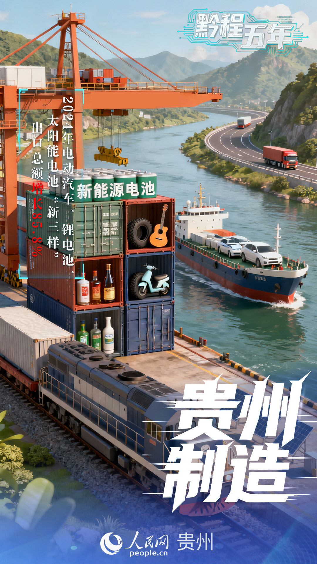 用好西部陸海新通道建設機遇,以東南亞、南亞、中亞為重點擴大對外開放,推動新能源電池、白酒、輪胎、吉他等“貴州制造”走向國際市場,2024年電動汽車、鋰電池、太陽能電池“新三樣”出口總額增長85.8%。